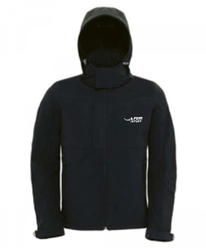 Schwarze Softshelljacke mit Kapuze in Damen und Herrenvariante bestellbar mit iSTUFF-Aufdruck in weiß auf dem Rücken (bitte nicht von der Überschrift der Bilder irritieren lassen).