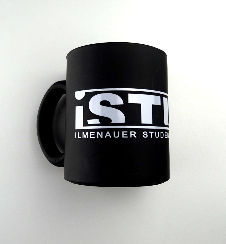 Schwarze satinierte Glastasse mit weißem iSTUFF-Aufdruck.