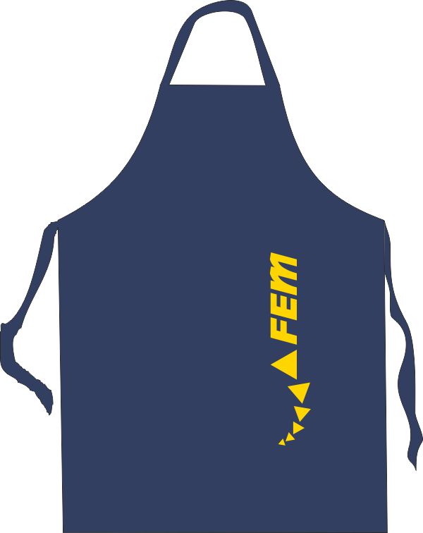 Latzschürze in navy mit Aufdruck FeM-Logo in goldgelb